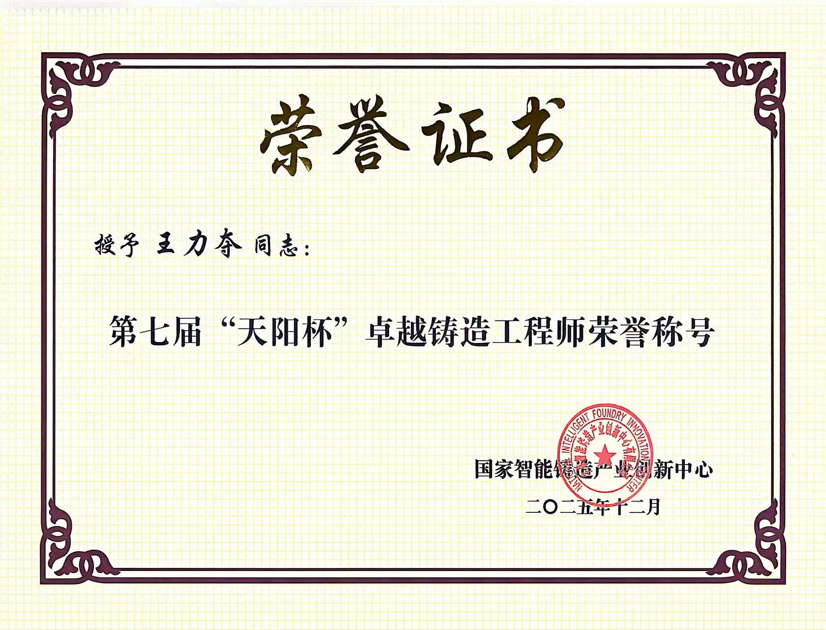 恭喜公司总经理王力夺先生荣获第七届天阳杯卓越铸造工程师称号,此次评选由国家智能铸造产业创新中心组织,经过多环节考核,王总以从业二十三年经历,在砂铸,精铸,重力和低压铸造工艺方面的研究和技术创新获得此项殊荣。